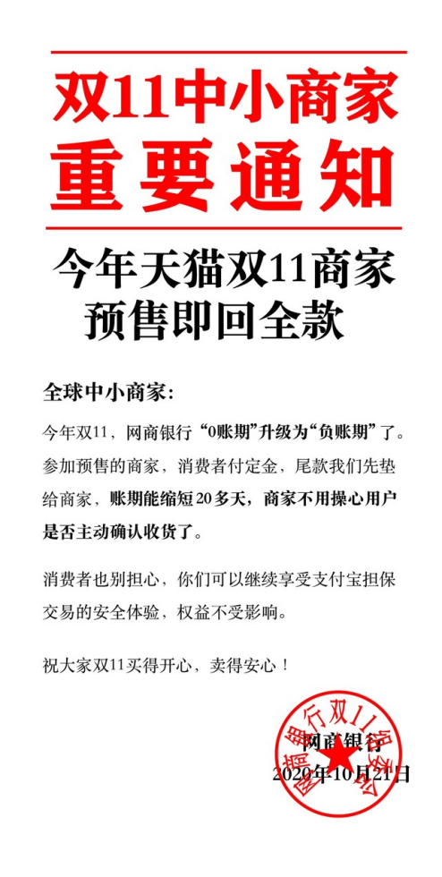 众所周知,为了保护消费者权益,只有消费者确认收获,卖家才能拿到货款。就在今年11前夕,义乌17家行业协会的百名中小商家,联合发出倡议书,号召双11消费者今年收货后,尽快点击“确认收货”。对此,支付宝官方率先做出了回应,表示网商银行已推出“负账期”举措,消费者参加双11预售支付定金,商家就能收到网商银行垫付的全款,账期缩短长达20多天。