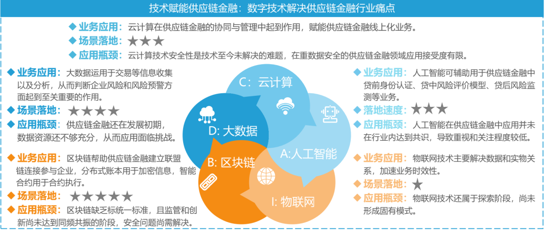 报告还指出,传统供应链金融行业的诸多痛点导致风险防控的难度较高。虽然目前,ABCDI五大技术用于供应链金融不同流程以提升风控效能,但技术融合应用落地的效果并不理想。其中,区块链技术是供应链金融中最为成熟的主要落地场景之一,然而不同技术落地速度大相径庭,现阶段并未实现五大技术结合的应用落地。报告建议:要实现产业和金融有效结合,单一技术应用难以独立完成,所以五大新兴技术相互结合才可以攻克供应链金融发展中的难点,加速实现供应链金融中“商流”、“物流”、“信息流”以及“资金流”四流合一的进程。