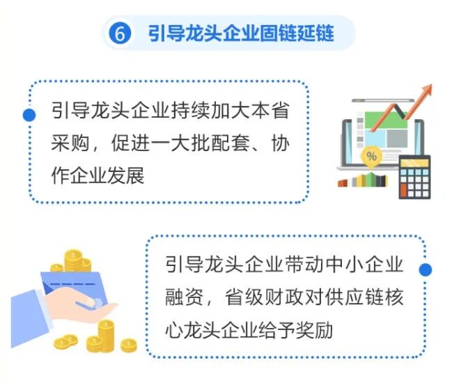 在精准对接龙头配套项目方面,政策指出,“围绕龙头企业梳理原材料、销售端、供应链等配套情况,强化上下游协同攻关,推进进口产品技术省内国内替代,精准策划生成一批产业链缺失、延伸项目和龙头企业配套项目。”