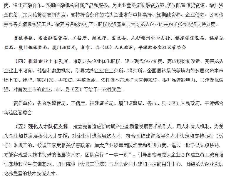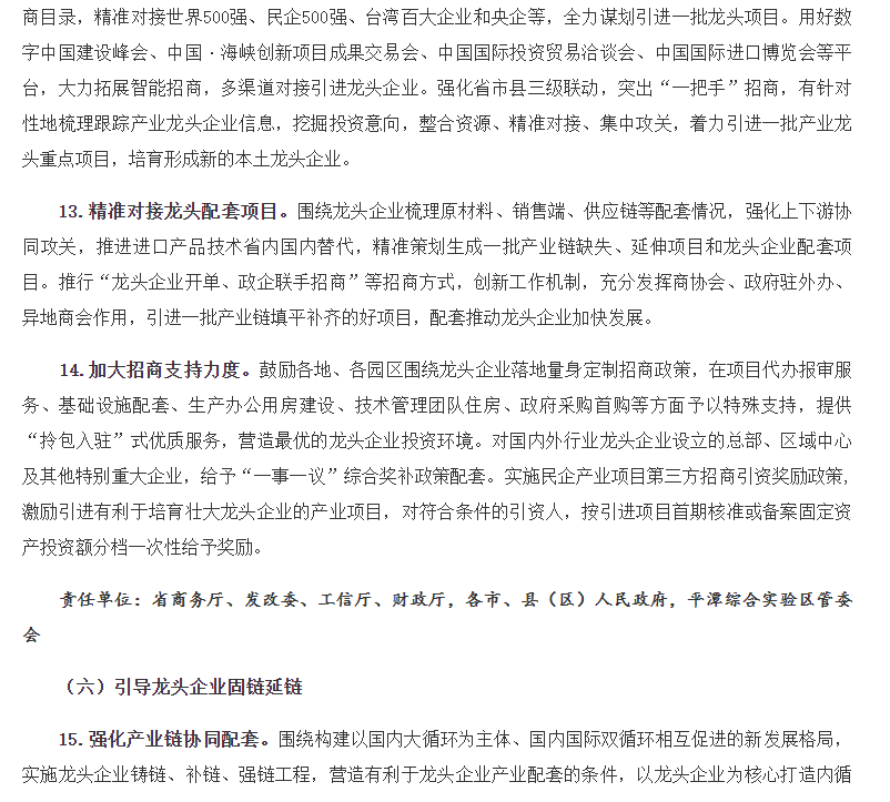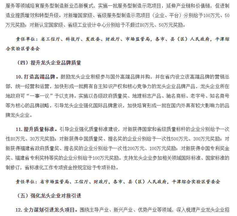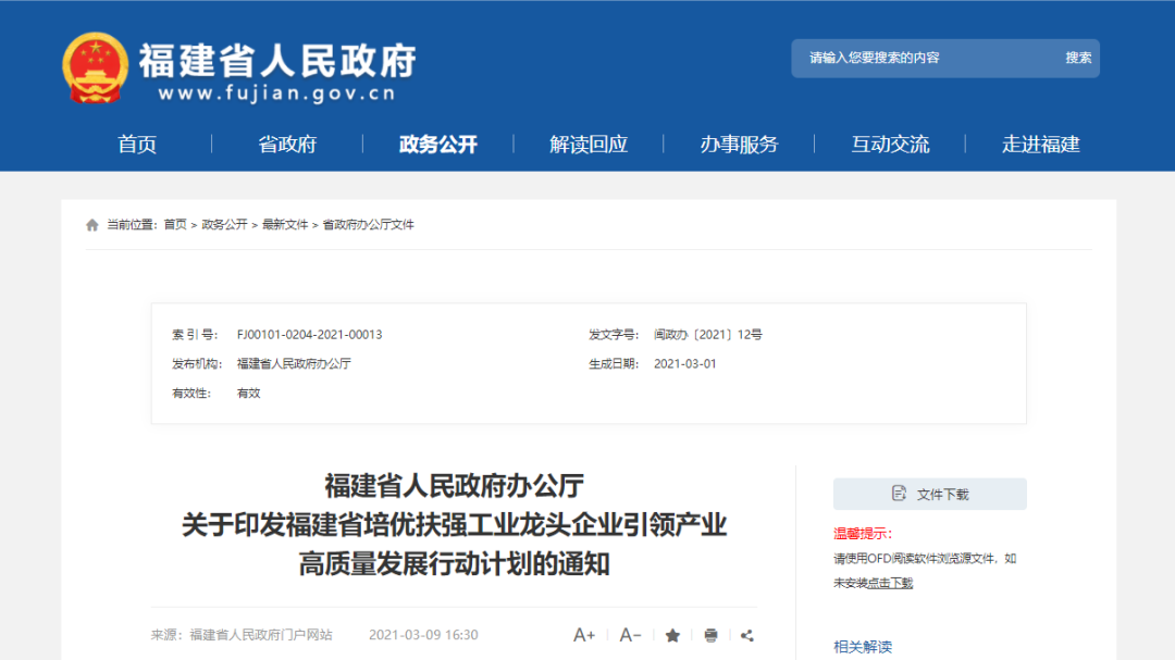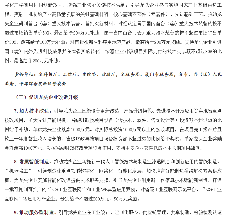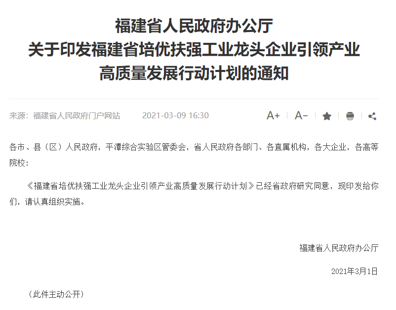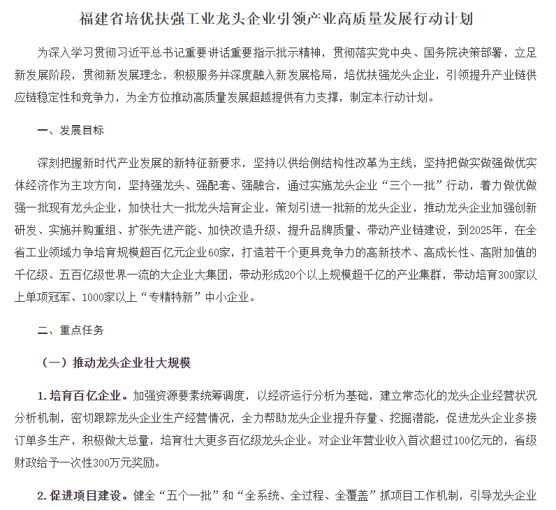 近日,万联网记者获悉,福建省人民政府办公厅于3月9日发布了《福建省培优扶强工业龙头企业引领产业高质量发展行动计划》(以下简称《行动计划》)通知。政策的发布旨在培优扶强龙头企业,引领提升产业链供应链稳定性和竞争力,与此同时,也为符合要求的龙头企业设置了30万以上1000万元以下的奖励补贴。