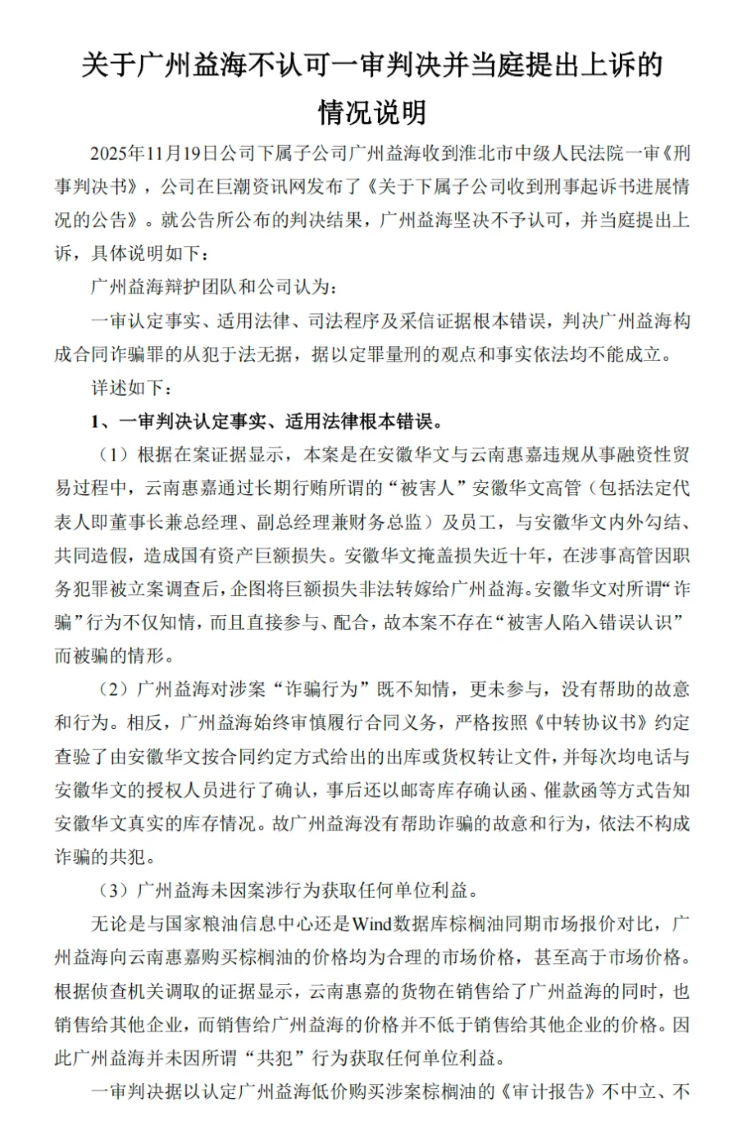 另外,根据媒体提供的一份《关于广州益海不认可一审判决并当庭提出上诉的情况说明》显示,广州益海辩护团队和公司认为:一审认定事实、适用法律、司法程序及采信证据根本错误,判决广州益海构成合同诈骗罪的从犯于法无据,据以定罪量刑的观点和事实依法均不能成立。