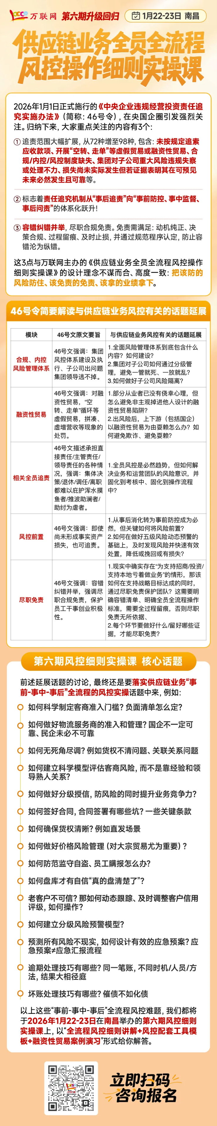 而到了第六期课程,我们更新迭代了不少内容,融合了46号令中大家尤为关注的合规与风险点,不仅有全流程风控细则讲解、风控配套工具模板,还有融资性贸易案例演习,万联网首席风险管理实战专家张洪江、万联网首席供应链业务法律风控专家张春艳,2位老师还会把46号令揉碎了、讲透了。不管你是想搞懂新规边界,还是想建立一套覆盖事前-事中-事后全流程、全员参与的供应链业务风控操作细则规范,这堂课都能帮你少走弯路、少踩坑。