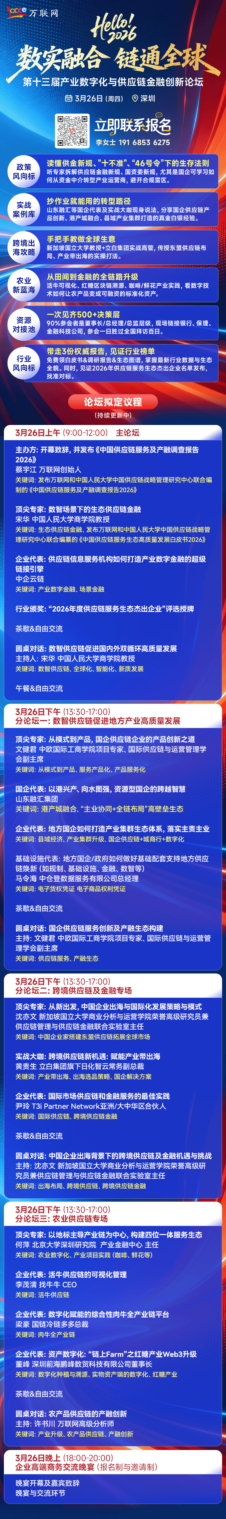 2026年3月26日,由万联网在深圳主办的第十三届产业数字化与供应链金融创新论坛,就是专门为供应链行业的龙头、央国企、金融机构、科技公司量身打造的转型导航站+资源对接局,500+行业决策层齐聚,不整虚的,全是能落地的干货、能对接的资源、能抄作业的标杆,帮你把转型的迷茫、内卷的焦虑,全给捋顺了。