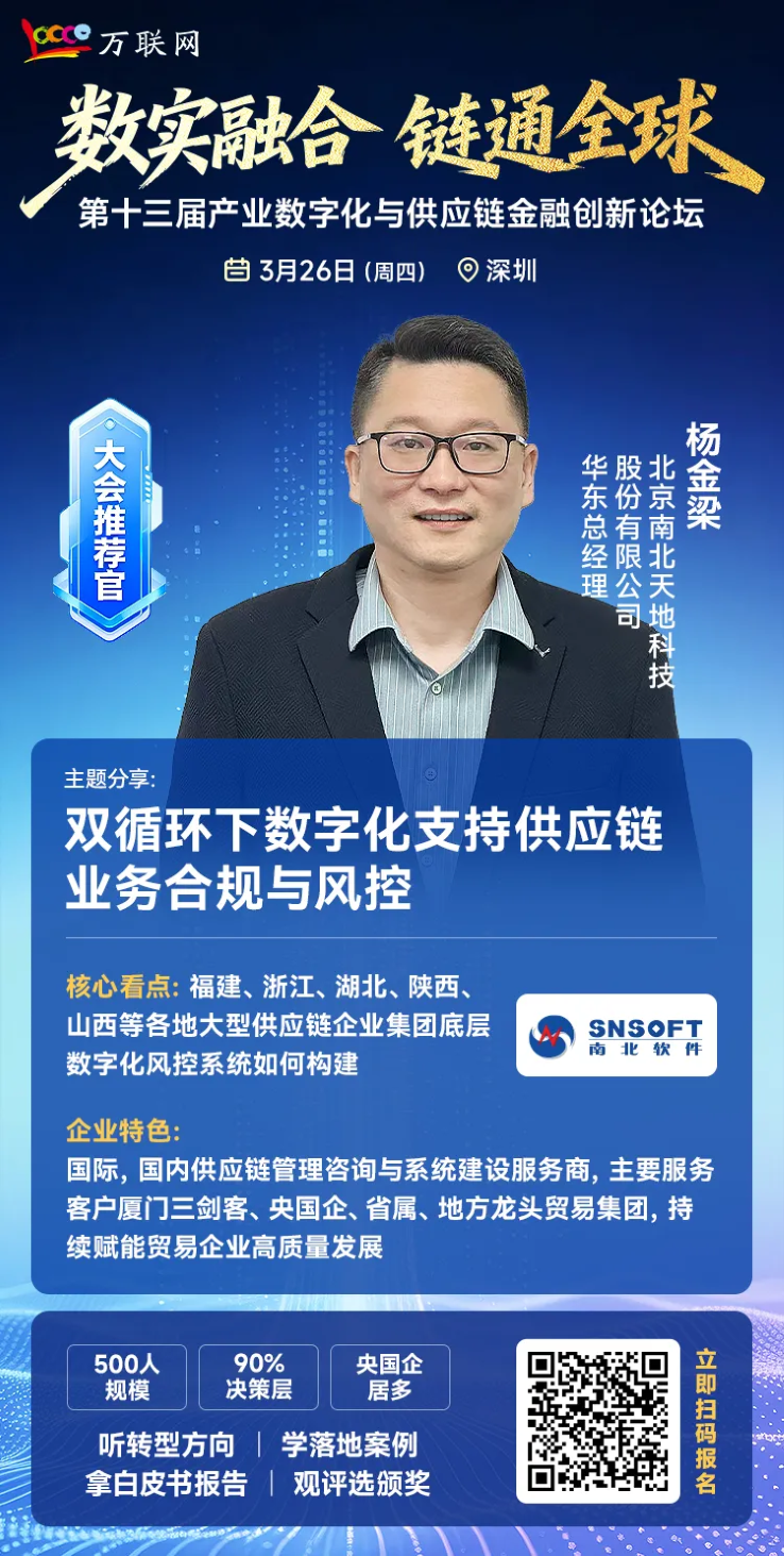 2026年3月26日,万联网将在深圳主办第十三届产业数字化与供应链金融创新论坛。我们重磅邀请了一位特殊的嘉宾——北京南北天地科技股份有限公司华东大区总经理杨金梁。