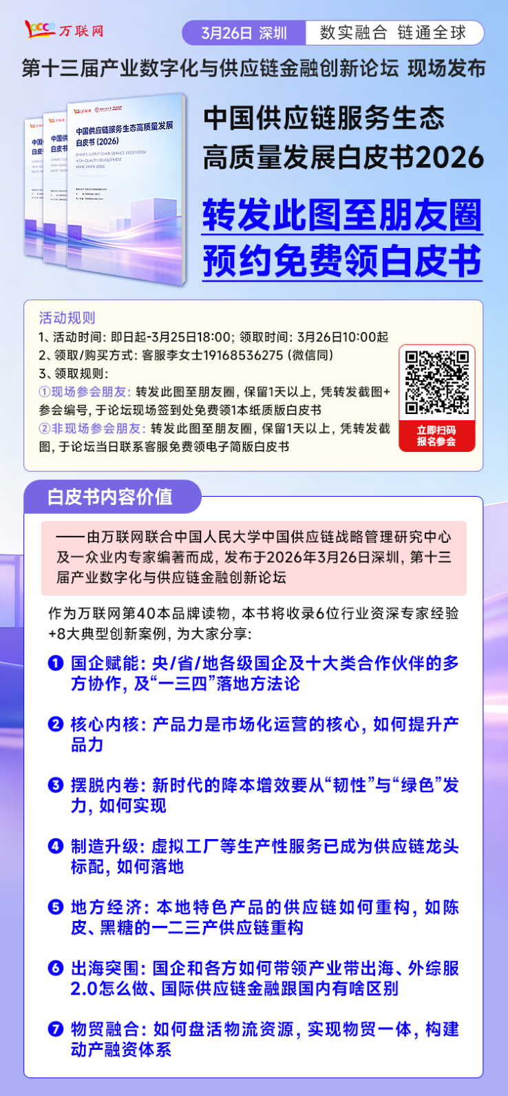 由万联网联合中国人民大学中国供应链战略管理研究中心以及一众业内专家重磅编制的《中国供应链服务生态高质量发展白皮书2026》,将于2026年3月26日在深圳举办的第十三届产业数字化与供应链金融创新论坛现场正式发布!