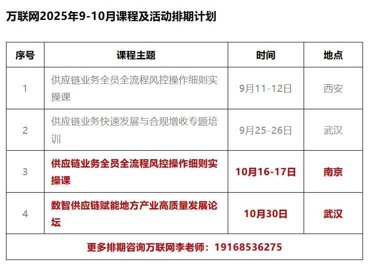 1、培训服务:万联网将根据您的实际现状与难题,组织大型集团企业风险管理专家、供应链业务实战专家、供应链业务法律专家、货权管理专家等联合授课,带您构建全面风险管理体系,全员风控、全流程动态风险风控,做好业务与风险的战略平衡、集团分子公司的业务风险管控与风险隔离、客商信用动态管理、业务风险分级管理、风控权责绩效设计、商账管理,具体细分产业领域业务风险管控,以及法律风险、货权风险管控等内容,帮您将风控打造成核心竞争力,为业务高质量发展保驾护航。