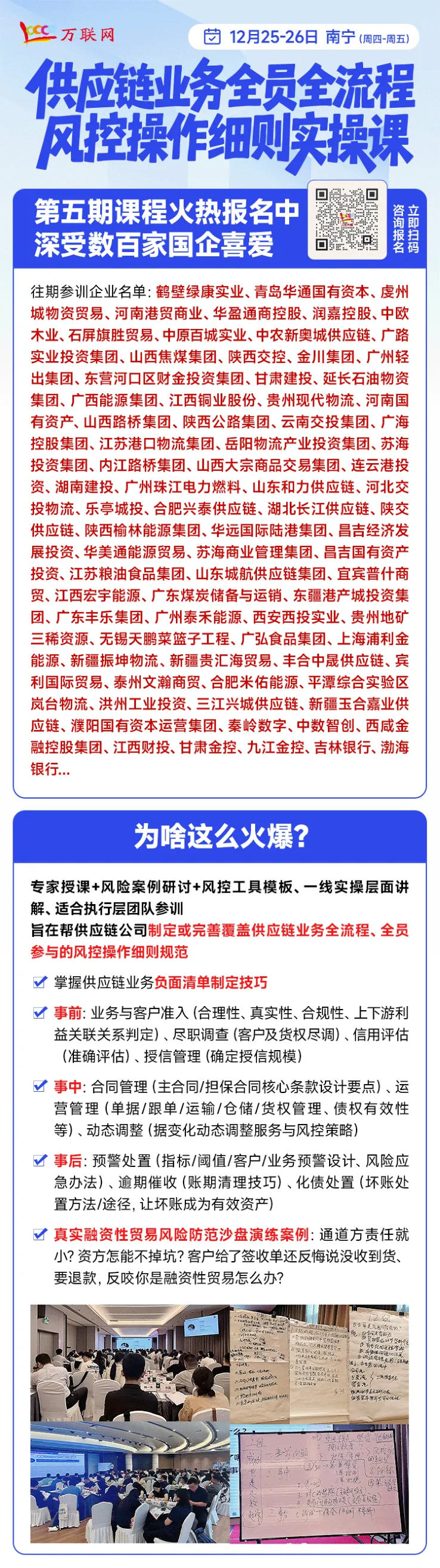 而本期《供应链业务全员全流程风控操作细则专题课》,也将汇聚数十家来自全国各地的国资国企,也是供应链业务交流的最佳阵地,也欢迎大家踊跃前来报名。