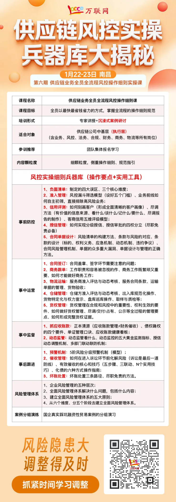 为助力国企供应链公司以最快速、最省钱、最省力的方式升级风控工作的方式方法,自检业务中的不合规与风险点,建立起供应链业务负面清单,并形成一套完整的覆盖全流程、全员参与的风控操作细则规范,万联网将于2026年1月22-23日在南昌举办第六期《供应链业务全员全流程风控操作细则实操课》。前五期课程一经推出,便累计吸引了400多位来自近200家大型国企集团的高管组团报名。