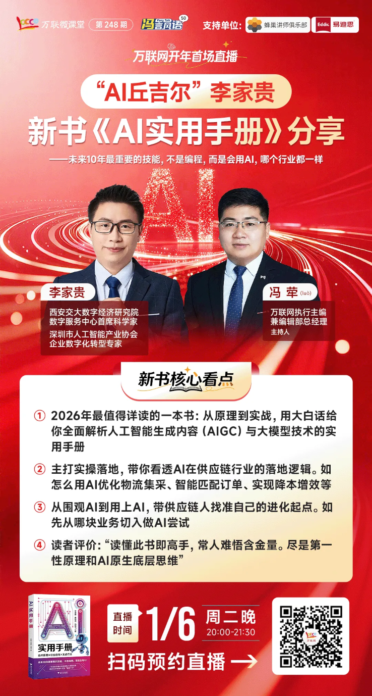 2026年1月6日晚8点,万联网视频号直播间。让我们一同拆解AI,让它不再悬浮于概念,而是真正服务于你的每一份订单、每一次降本。开年第一课,为你的2026年,装备一份清醒而实用的AI行动指南。