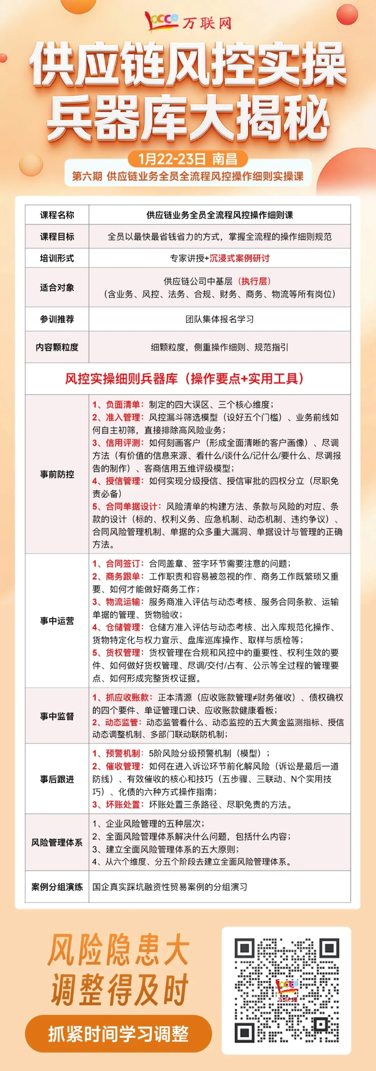为助力国企供应链公司以最快速、最省钱、最省力的方式升级风控工作的方式方法,自检业务中的不合规与风险点,并形成一套完整的覆盖全流程、全员参与的风控操作细则规范,万联网将于2026年1月22-23日在南昌举办第六期《供应链业务全员全流程风控操作细则实操课》。前五期课程一经推出,便累计吸引了500多位来自近200家大型国企集团的高管组团报名。