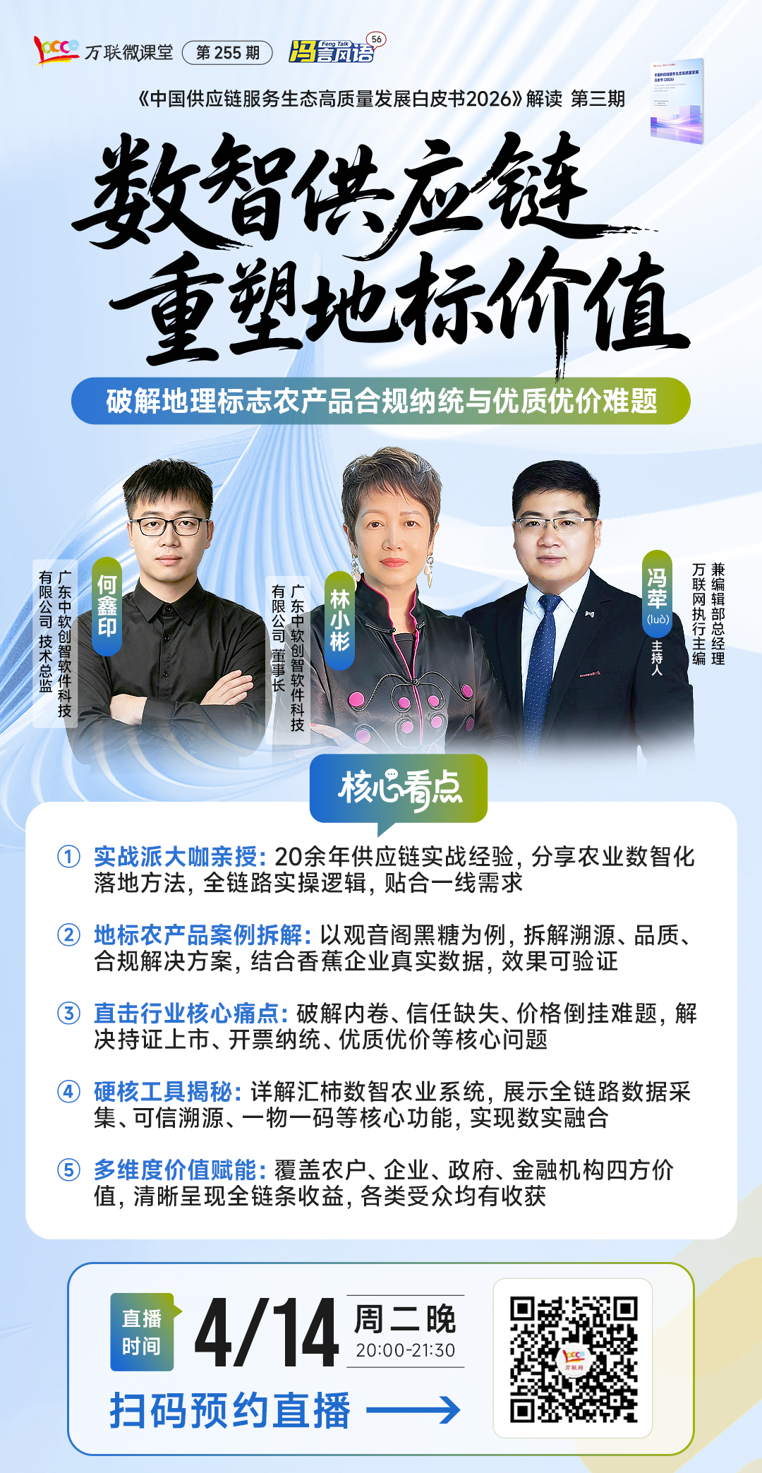 于是,2026年414日(周二)晚8,万联网第255期直播,就是专为国企农产品供应链人定制——《数智供应链重塑地标价值,破解地理标志农产品合规纳统与优质优价难题》