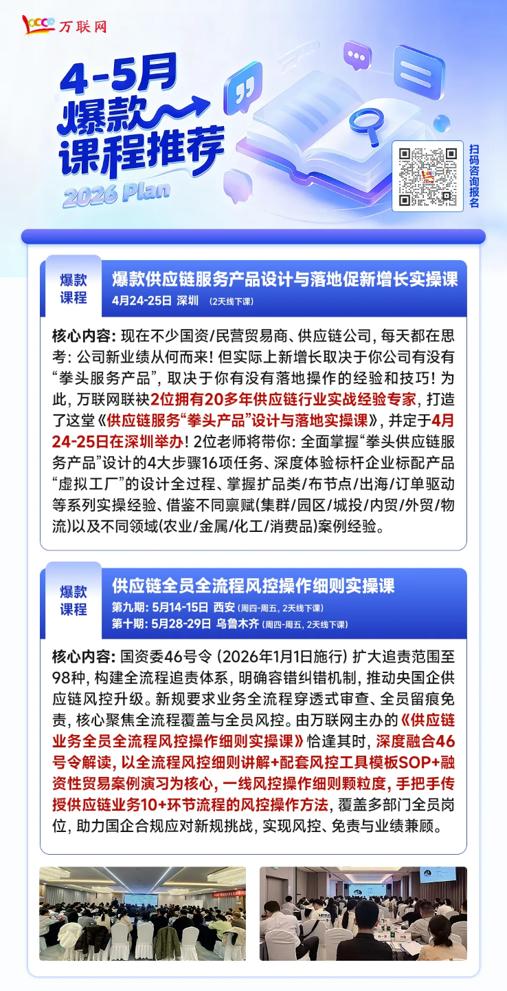 2026年5月14-15日,万联网将于西安重磅推出第九期《国资委46号令下供应链业务全员全流程风控操作细则实操课》。这不是一堂纸上谈兵的学院派课程,而是一份由2位拥有20多年实战风控经验的专家老炮亲授、深度融合国资委46号令与“十不准”红线、以风控细则+工具模板+融资性贸易沙盘演练为核心武装的国企供应链生存作战手册,从准入、尽调、授信、合同、货权、仓储、预警、催收、化债等全流程给你拆透里面的风险点到底怎么控。