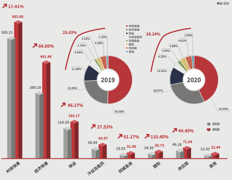 具体业务上,顺丰2020全年件量同比增长68.46%,超行业整体增速的31.2%,市占率提升至9.76%,较上年提升2.15个百分点。