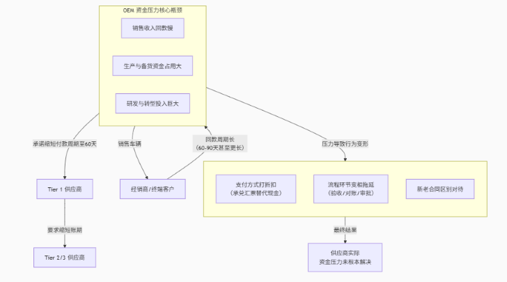 汽车行业长期存在账期显著延长,严重挤压供应商现金流的情况。此前部分车企将账期延长至180天,叠加降价压力形成双重“绞杀”。有供应商甚至被迫接受“降价15%+延长账期60天”条款,现金流周转天数突破240天警戒线。这种状况对供应链生态健康构成了严重威胁。