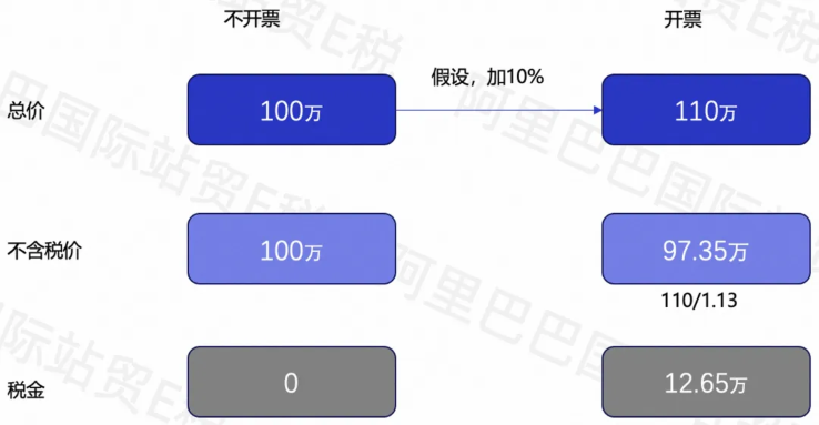 其次,梳理业务模式,尽可能走出口退税通道,增加企业利润。出口退税是国家为增强出口产品竞争力提供的税收优惠政策,合理利用退税不但可以合规,还能为企业增加利润。以下面以下面图片为例,加价10%开票,可以退13%的税,实际利润增加2.65%。