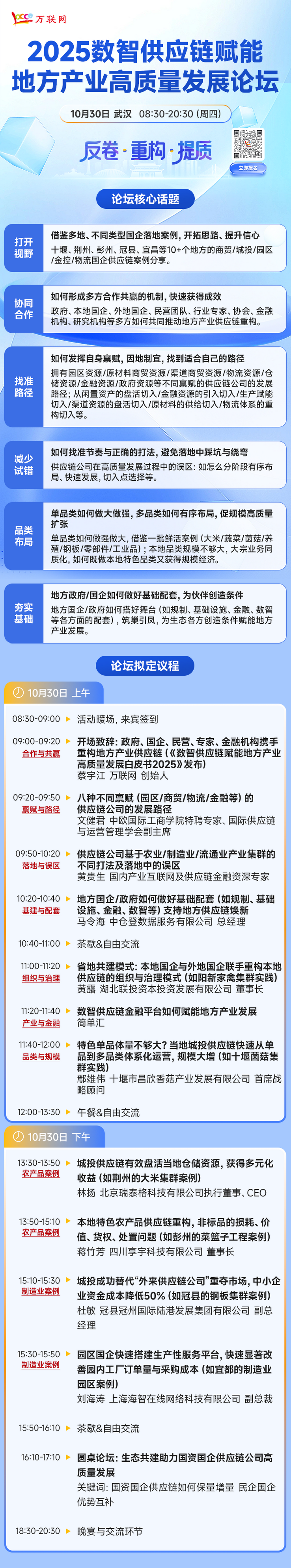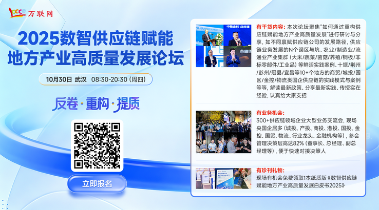 为此,作为国内领先的产业数字化与产融创新智慧服务平台,万联网将于2025年10月30日在武汉举办“2025数智供应链赋能地方产业高质量发展论坛”。本次大会将聚焦“如何通过重构供应链赋能地方产业高质量发展,邀请行业专家及一线实践标杆企业代表,围绕“反卷·重构·提质”展开务实研讨,给大家认真支招、传授实在经验。