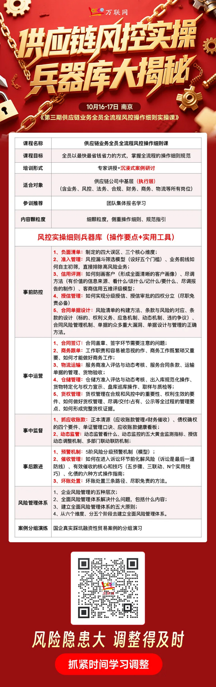所以,为助力国企供应链公司以最快速、最省钱、最省力的方式升级风控工作的方式方法,自检合同以及业务中的不合规与风险点,规避掉入融资性贸易的陷阱中,同时建立起供应链业务负面清单,并形成一套完整的覆盖全流程、全员参与的风控操作细则规范,我们将于10月16-17日在南京举办第三期《供应链业务全员全流程风控操作细则实操课》。