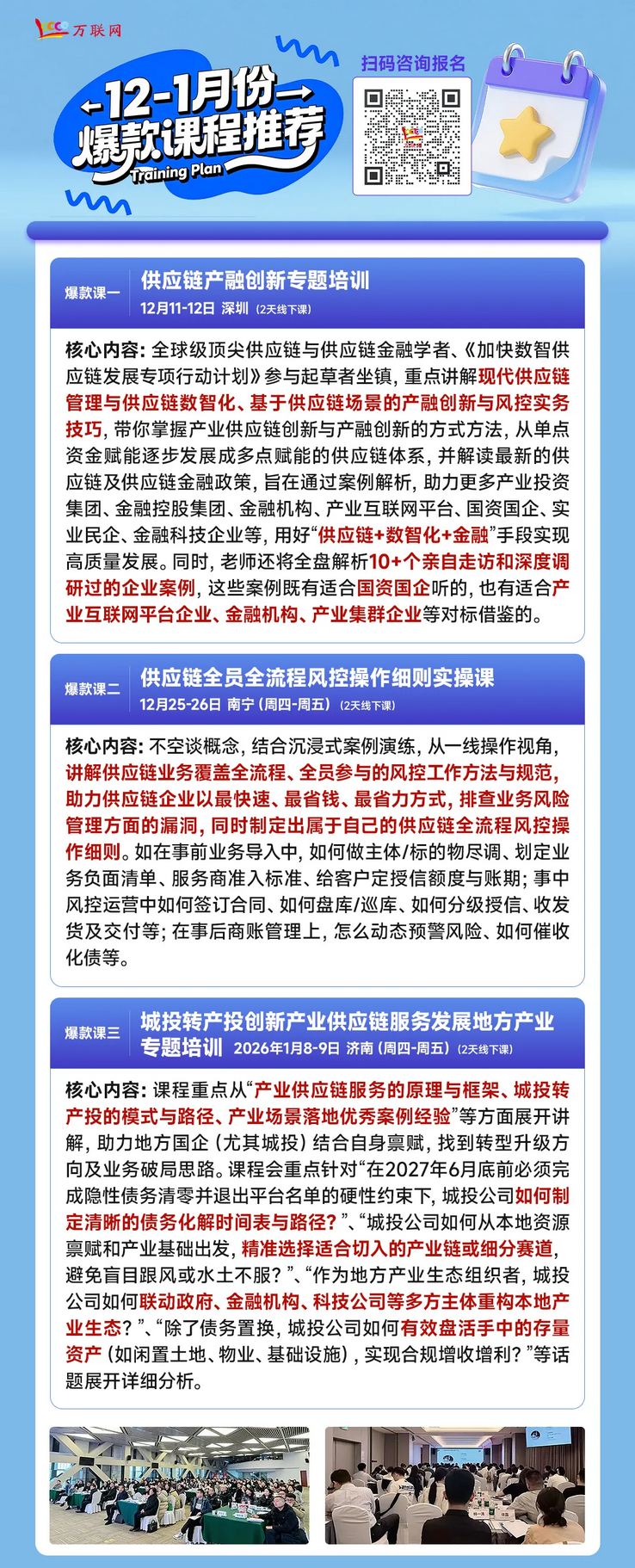 除上述课程外,近期我们还举办了供应链全员全流程风控细则实操课、供应链产融创新专题培训、供应链业务合规增收专题培训、供应链全面风控体系构建专题课、农产品供应链实操课、煤炭供应链实操课、“十不准”下合规与风控实操课等,广受众多国资国企的喜爱与欢迎,学员企业包含:中国物资储运集团、中国煤炭科工集团、中国兵工物资集团、中国航油集团、中国石油、五粮液集团、新疆国投资本、连云港港口物流、四川华西集团、淮北矿业集团、陕西交控集团、陕西金控集团、陕西民东投资集团、陕西延长石油集团、陕西公路集团、陕西文投、广西投资集团、聊城金投控股、山东融汇物产集团、济宁能源发展集团、惠州市港口投资集团、泸州产业发展投资集团、合肥市产业投资控股、内蒙古交通集团、丰城金融控股集团、天津东疆发展(集团)、山西焦煤集团、晋陵集团、内蒙古圣圆能源集团、大庆市国投集团、青岛临空投资开发集团、开封金控投资集团、江西金融控股集团、苏美达、浙商中拓、华能电商、陕西交控、山西焦煤集团、包头正信集团、内蒙古交通集团、河南自然资源投资、新疆商贸物流、湖北商贸、湖北交投、湖北联投、武汉金控、甘肃建投、山东钢铁、厦门信达、厦门海峡、厦门港口、内蒙古通盛资本、北部湾投资集团、广西广投、广西北投、广西交通物资、淮安水利物资、山西天地王坡、贵州铁投、河南投资集团、前海产业发展集团、山东民生资源集团、深圳港口、新星丝路通、廊坊建设、北京首发、北京京粮、兴港集团、湖北长捷、湖北宏泰、四川联程资产、瓯江口产业集团、河南煤炭储配交易中心、廊坊国投、广州发展能源物流、安徽白帝集团、湖南建投、江西江冷、河南中豫、大河国际、交远物流、连云港投资、山东海洋投资、鹤壁绿康、国创鹤壁、苏海集团、西安政道桥建设、安琪酵母、五粮液、泸州老窖、通汇资本、中油物流、江苏沿海开发集团、安吉物流、佛燃能源、江西江投资本、黑龙江睿资产经营、江西蓝投、丰城金控、许昌金控、许昌投资、金航商业保理、鲁担产融、卓尔智联、中企云链、辽宁成大股份、九江银行、富民银行、渤海银行、山西银行、天津智能交通运行监测中心等集团及旗下企业等,吸引了1400多家央企、地方国企、上市公司的2100多位高层报名...