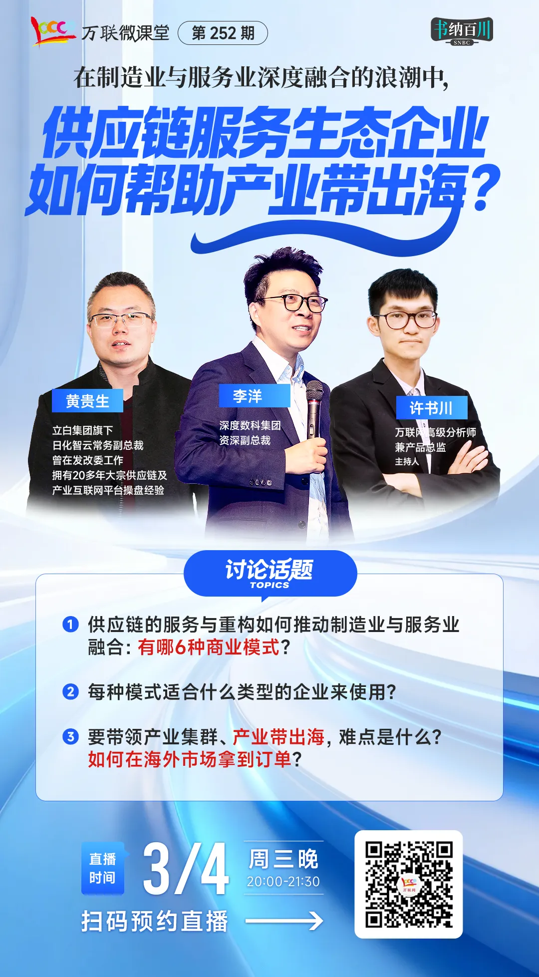 3位实战老炮将围绕6种商业模式展开深度拆解:供应链的服务与重构如何推动制造业与服务业融合?每种模式适合什么类型的企业?带队出海的难点到底卡在哪?海外订单怎么拿?