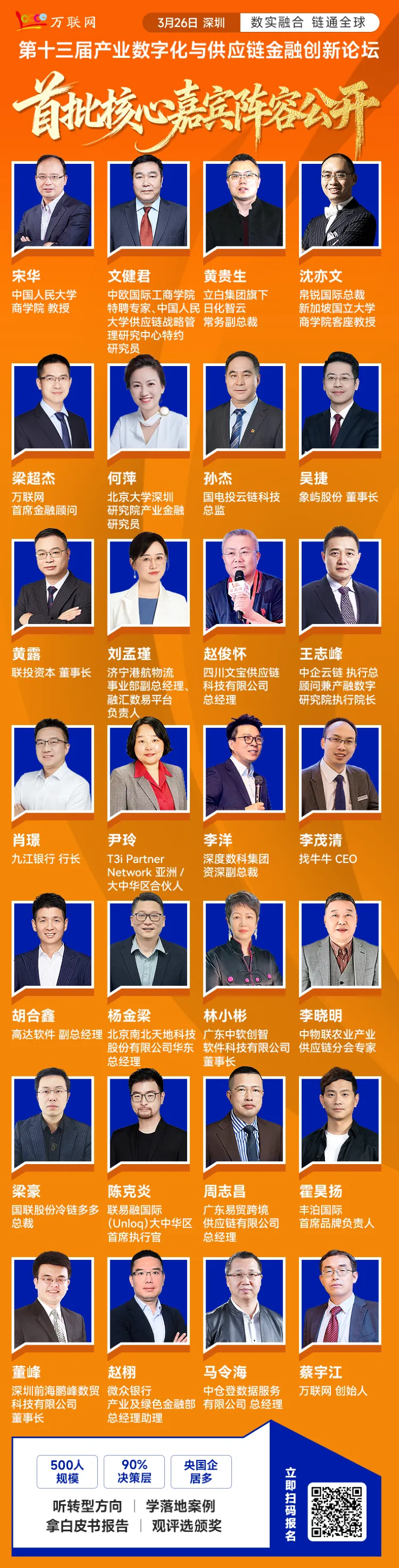 大会以 “数实融合?链通全球” 为主题,汇聚500+央国企/上市公司/行业龙头/供应链公司/物流商/科技服务商/金融机构高管精英,以及30+行业顶尖智慧——中国人民大学商学院教授宋华、中欧国际工商学院特聘专家文健君、新加坡国立大学商学院客座教授沈亦文、北京大学深圳研究院产业金融研究员何萍、万联网首席金融顾问梁超杰、中物联农业产业供应链分会专家李晓明6大顶尖专家学者,以及象屿股份、国电投云链科技、山东融汇集团、湖北联投资本、四川文宝供应链科技、中企云链、深度数科集团、找牛牛、高达软件、南北软件、中软创智、立白集团旗下日化智云、国联股份冷链多多、联易融国际、易贸跨境供应链、丰泊国际、鹏峰数贸科技、中仓登、九江银行、微众银行等行业顶流专家、实战大咖坐镇分享: