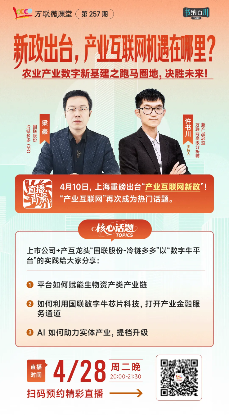 而2026年4月28日晚上20:00-21:30(周二),国联股份冷链多多CEO梁豪,将做客万联网视频号直播间,他会带着国联股份“十大多多”体系的成功经验,并结合亲手打造了“犇牛多多”平台的操盘经验,给你分享他们是怎么通过搭建产业互联网平台,把万亿级肉牛产业的堵点打通的:给牛装芯片、发“唯一数字身份证”,用AI大模型精准预测出肉率,搭建“产区仓+销区仓”智慧物流体系,把运输损耗压到2%以下,更打通了产业金融通道,解决养殖户贷款难的问题。